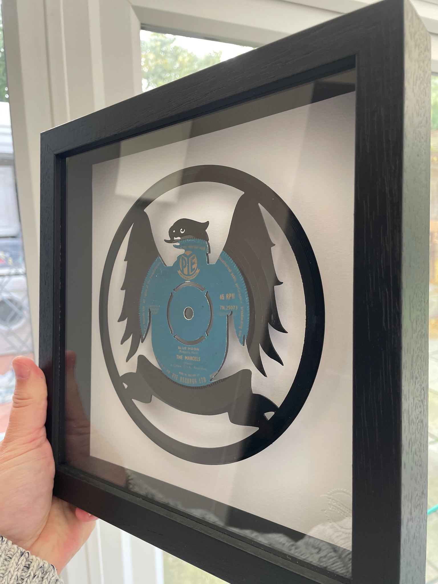 Individual piece of vintage vinyl art featuring the 1961 single Blue Moon by the Marcels, cut into the shape of City's classic club badge. This is the tune is traditionally sung on the terraces at every match. Mounted within a black wooden box frame and raised from a pearlescent base. The frame measures 25cm x 25cm (9.5 x 9.5 inches).