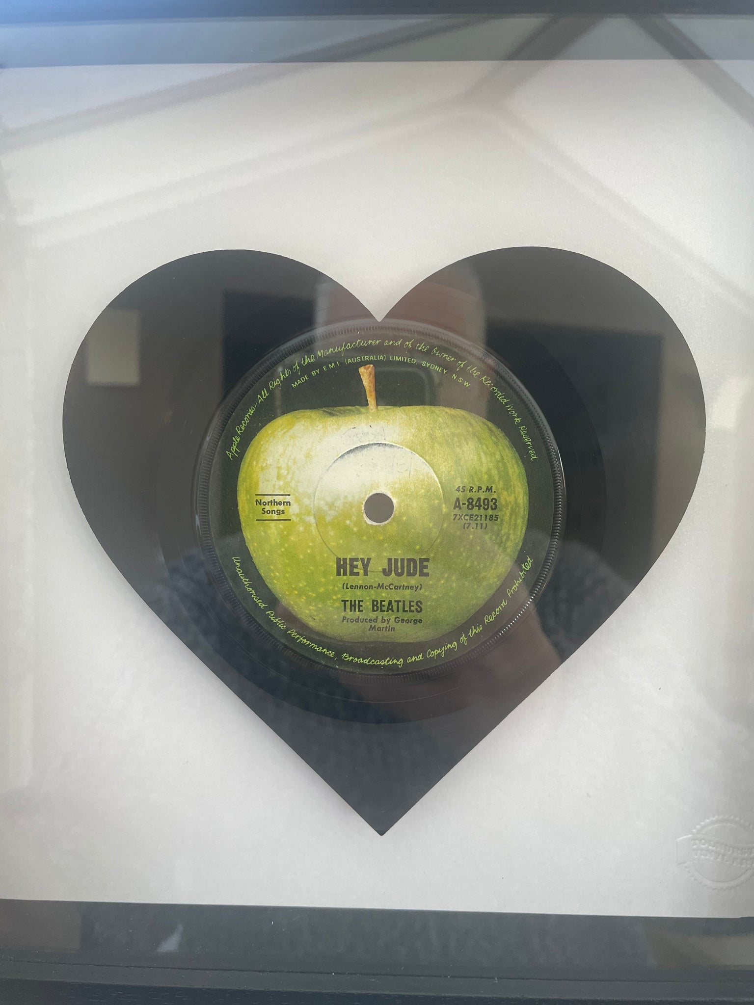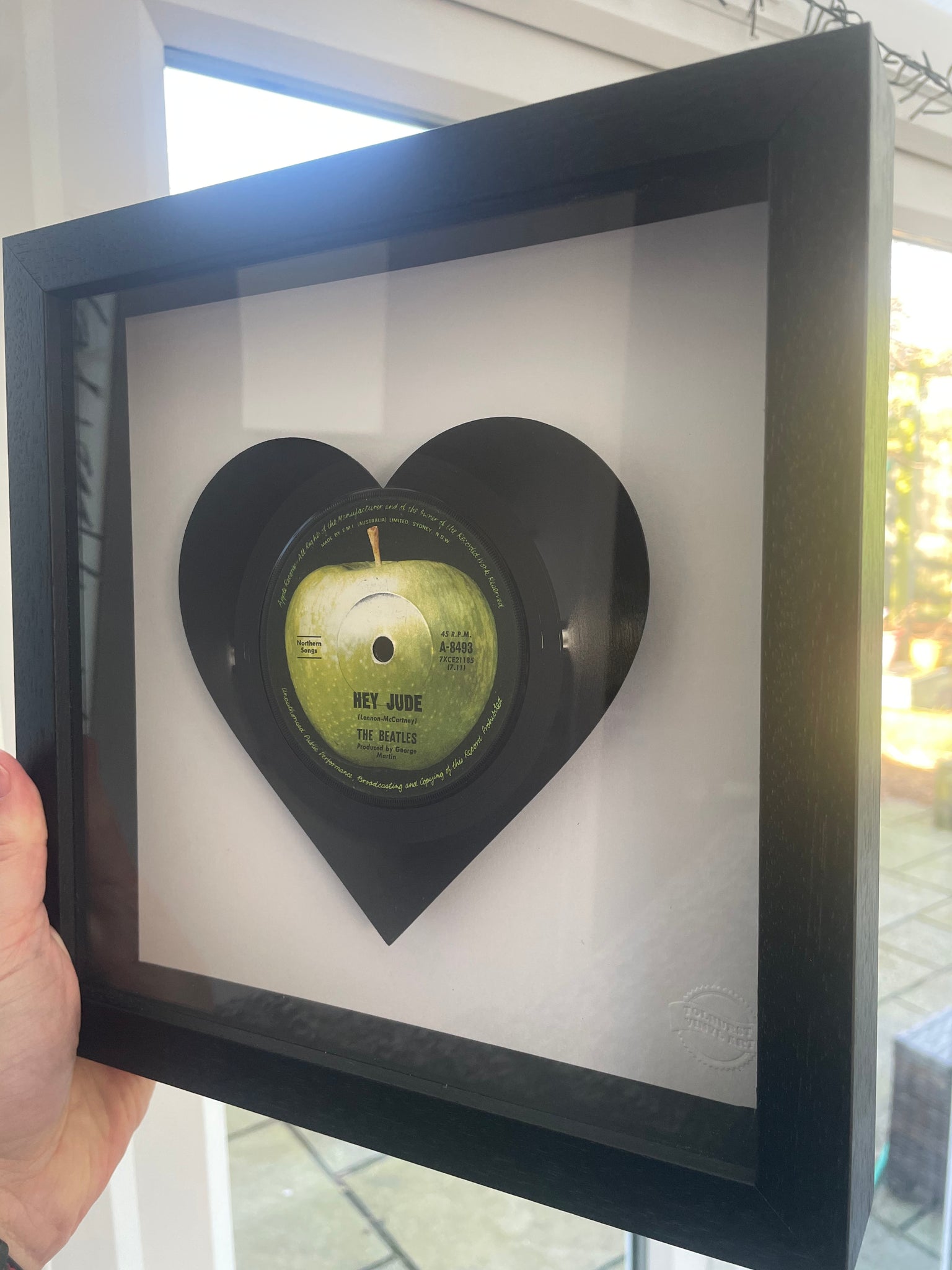 Individual piece of vintage vinyl art featuring The Beatles - All You Need Is Love cut into the shape of a heart. Mounted within a black wooden box frame and raised from a pearlescent white base to compliment the label. The frame measures 24cm x 24cm (9.5 x 9.5 inches). Other Beatles vinyl art available.