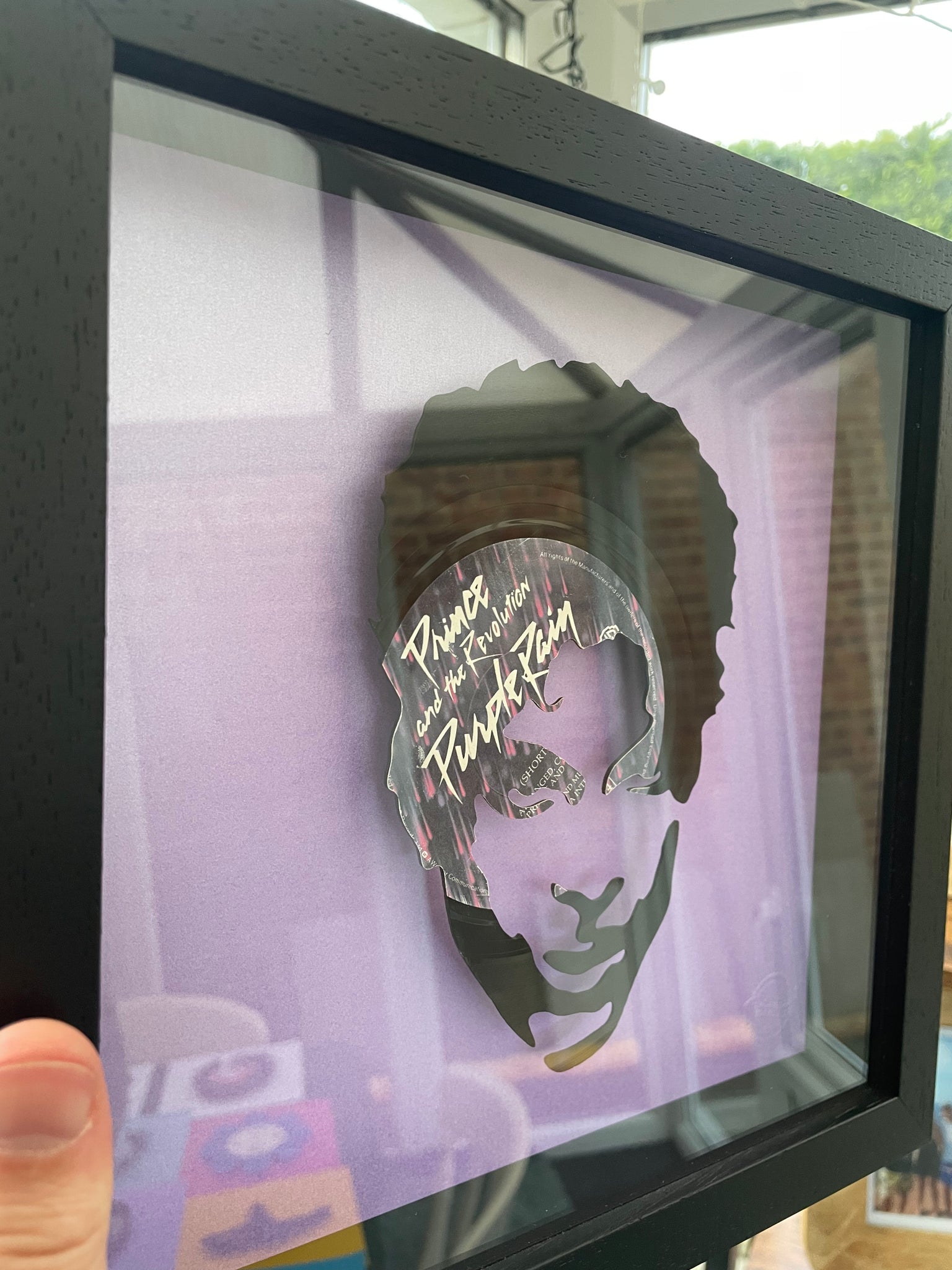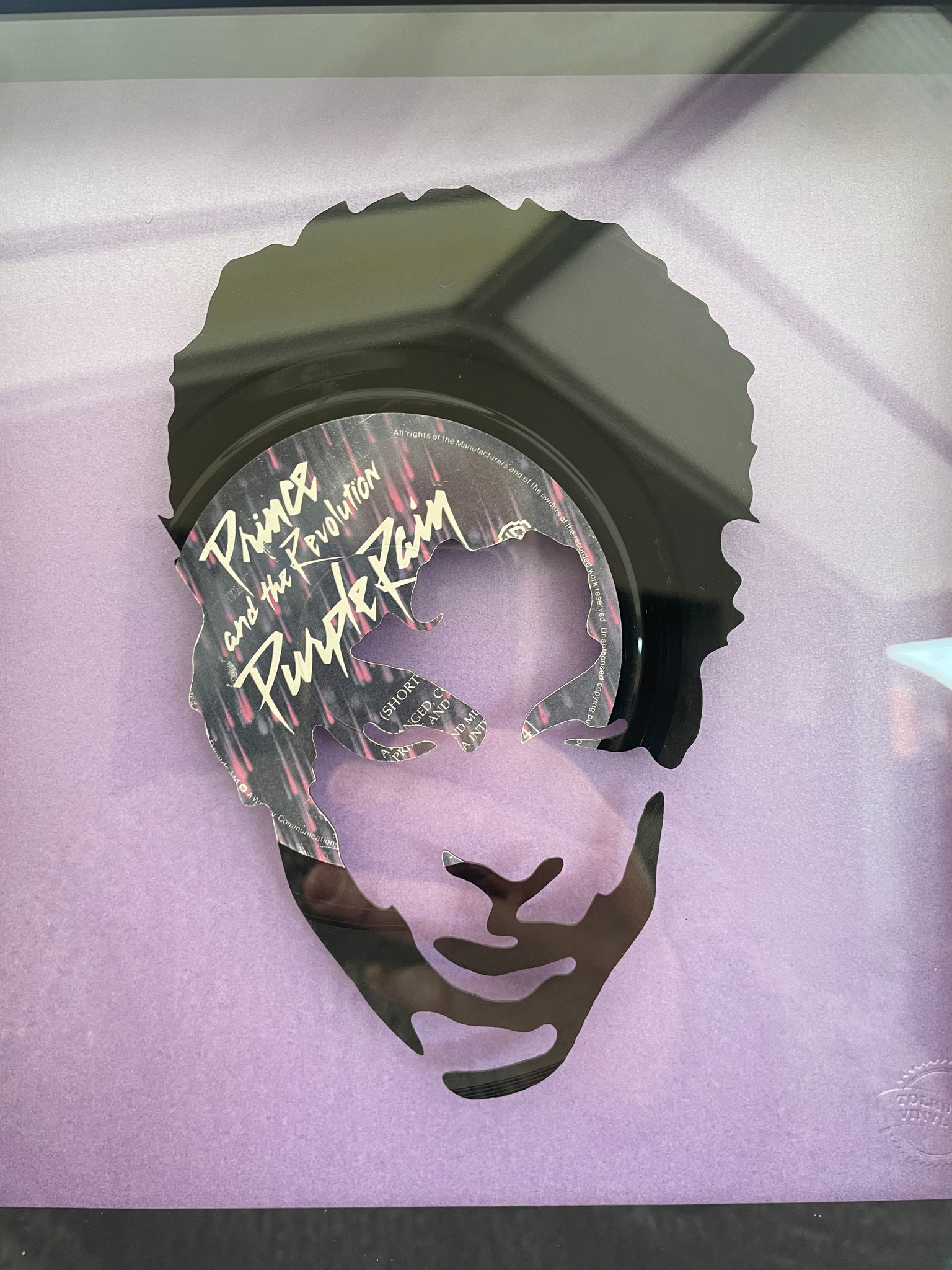 Individual piece of vintage vinyl art featuring the 1984 single Purple Rain by Prince and the Revolution. The record is cut to the iconic silhouette of Prince. Mounted within a black wooden box frame and raised from a pearlescent purple or white base. Other Prince vinyl art available.
