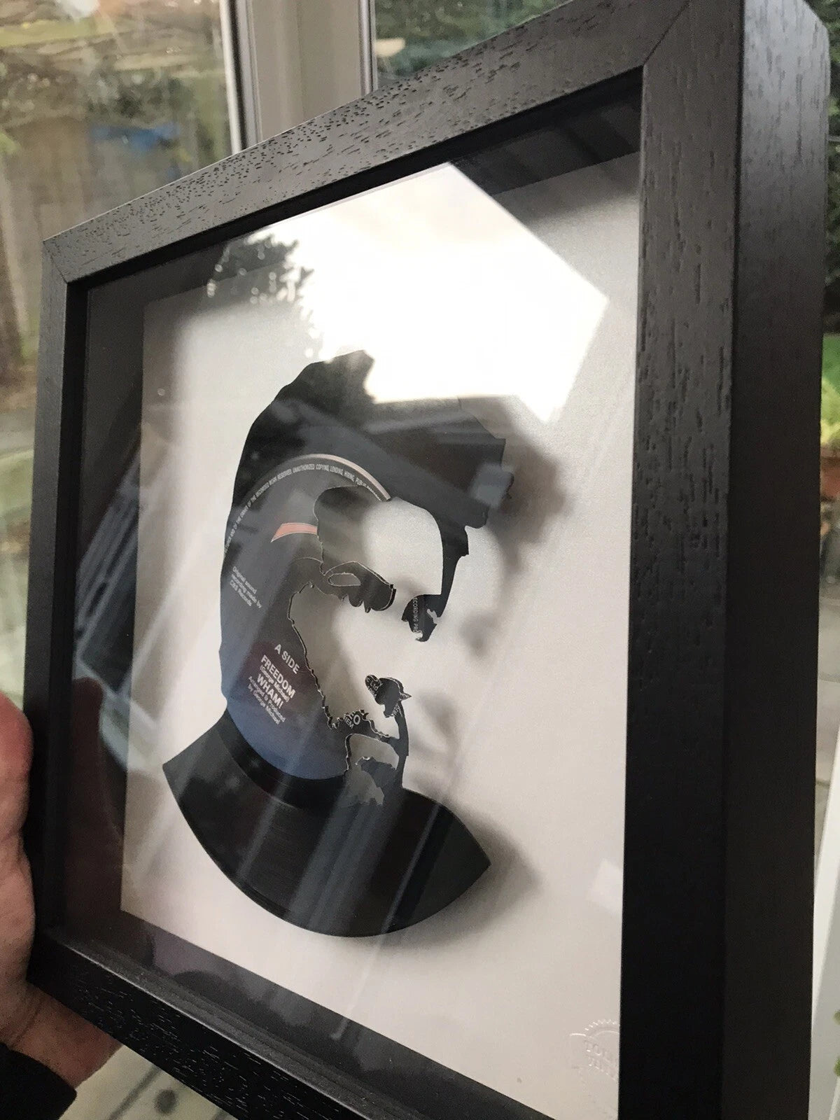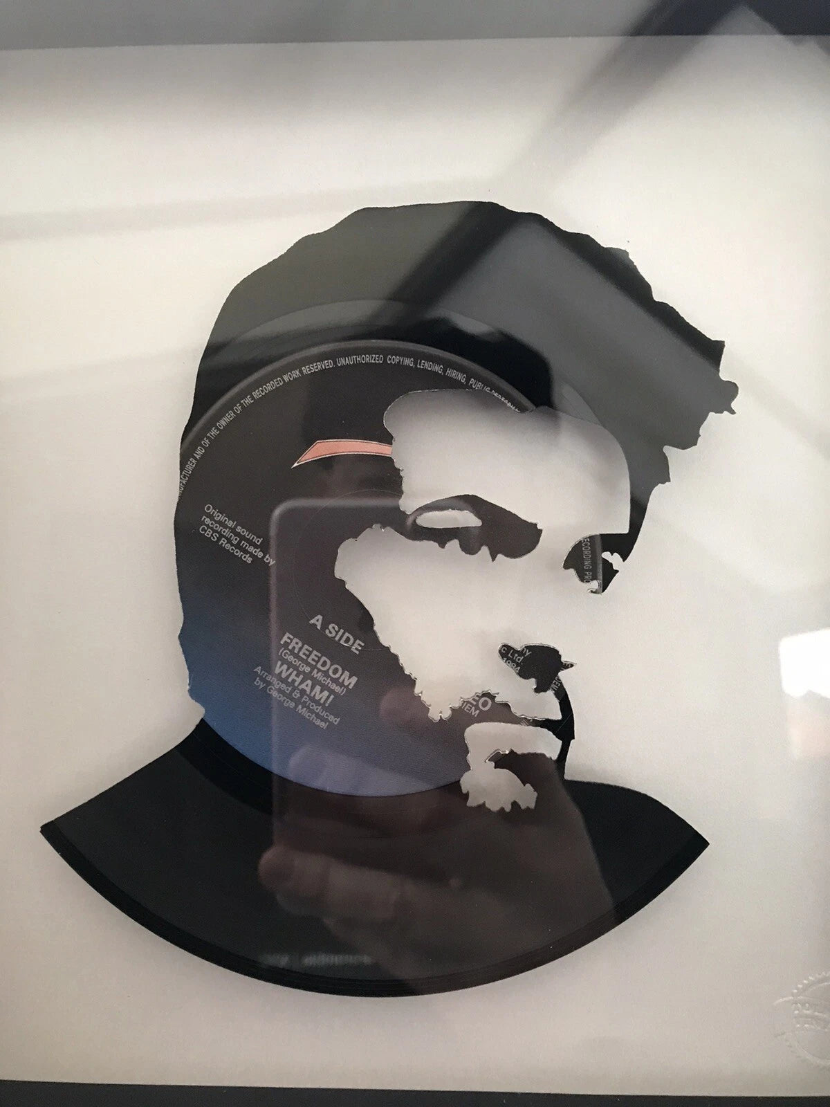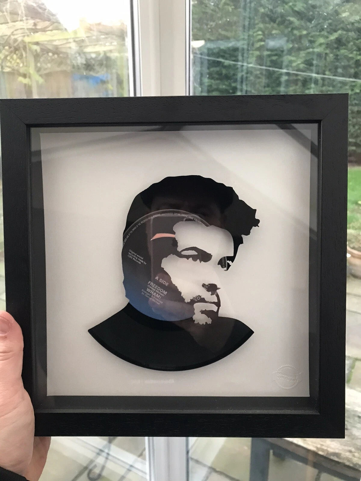 Individual piece of vintage vinyl art featuring the 1984 single Freedom by Wham! The record is cut to the silhouette of George. Mounted within a black wooden box frame and raised from a pearlescent white base. The frame measures 25cm x 25cm (10 x 10 inches). Other George Michael/Wham singles available upon request.