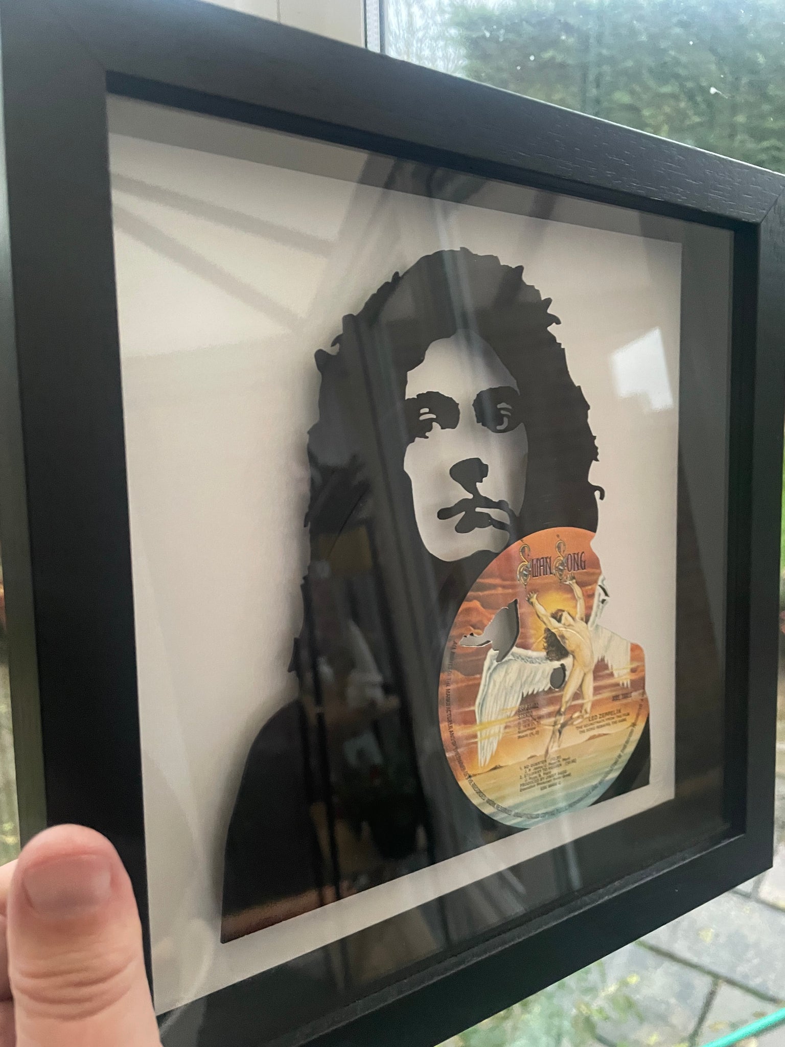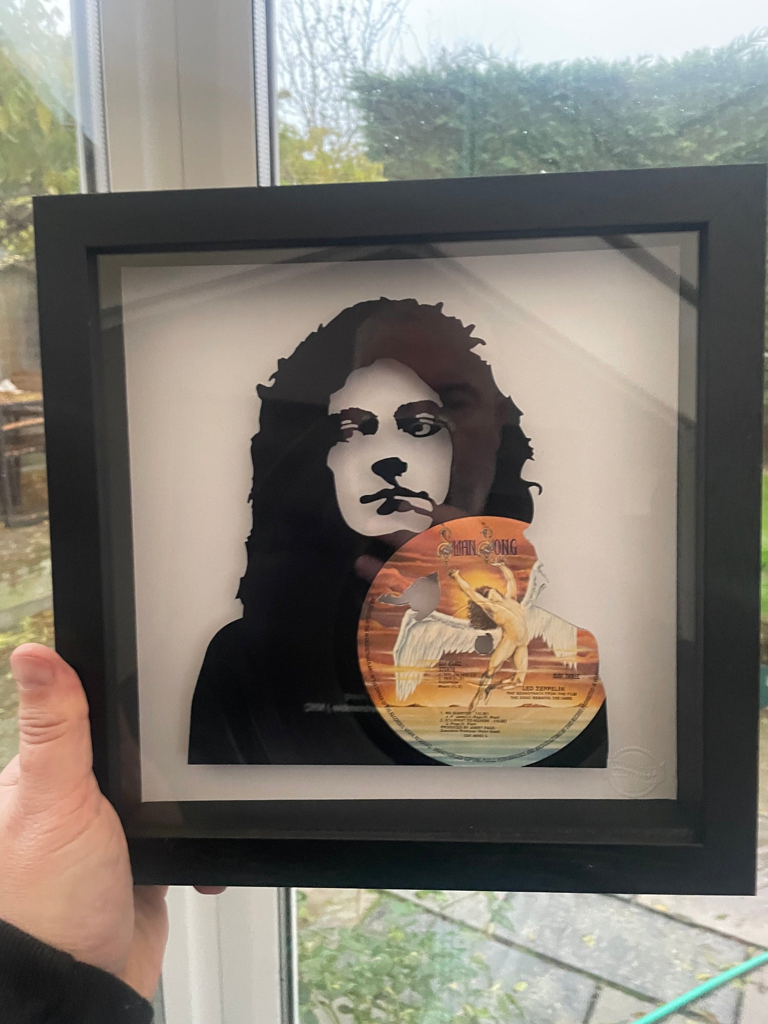 Individual piece of vintage vinyl art featuring the album The Song Remains the Same cut into the shape of legendary front man Robert Plant. Mounted within a black wooden box frame and raised from a pearlescent base to compliment the label. The frame measures 25cm x 25cm (10 x 10 inches). Other Led Zep titles available please message me for availability.