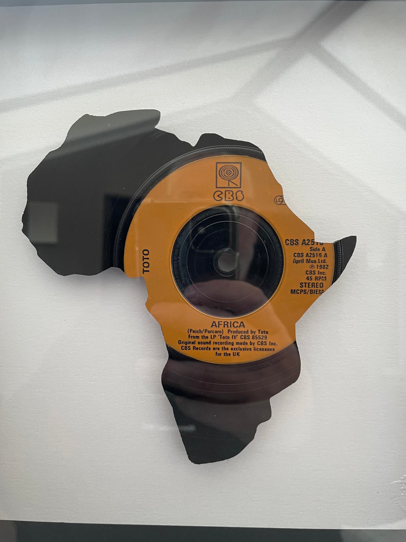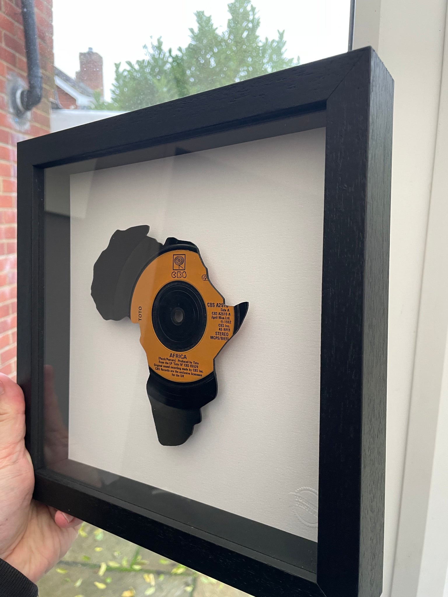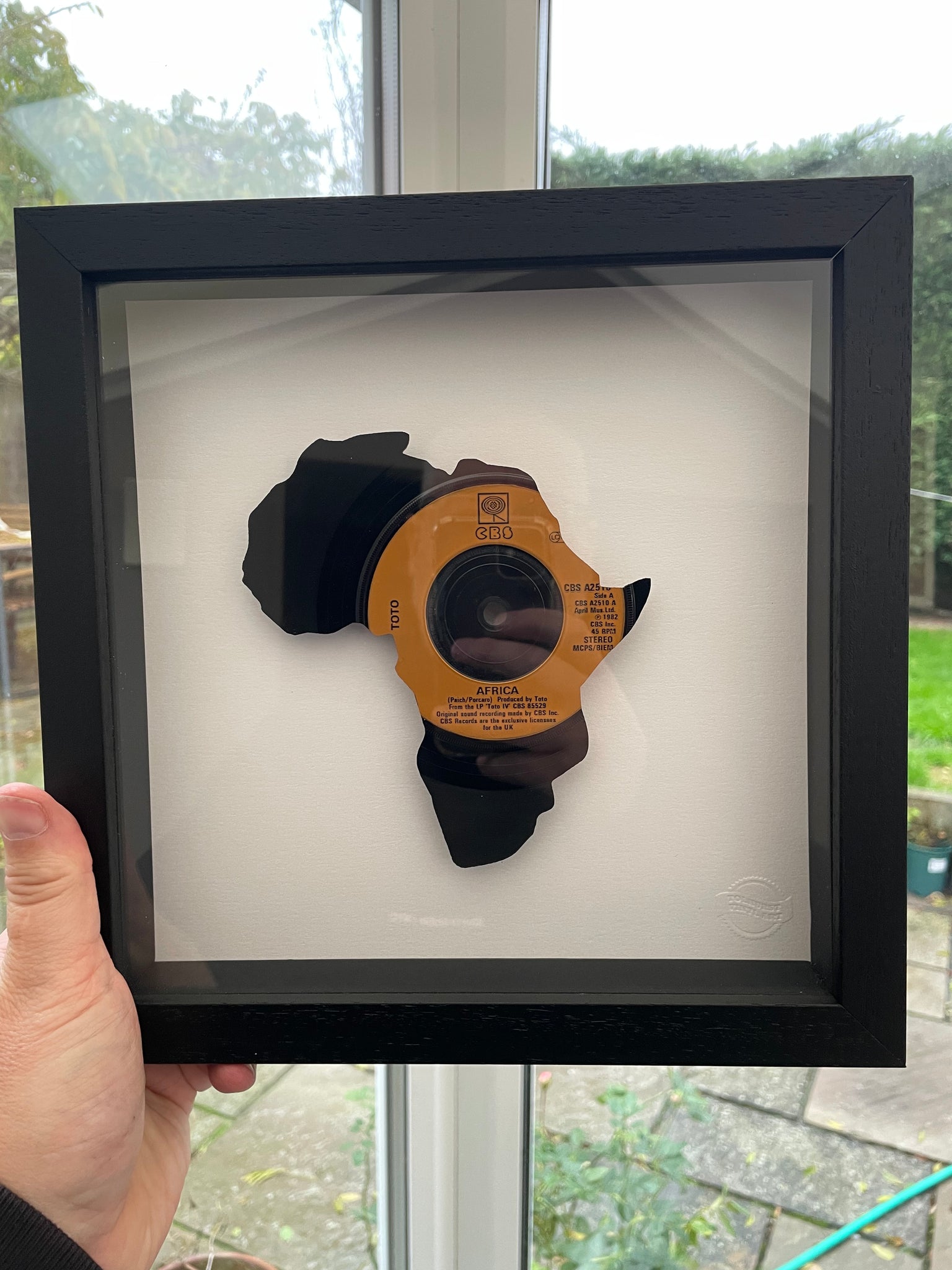 Individual piece of vintage vinyl art featuring an original 1982 7" Toto Africa single on the CBS label. Mounted within a black wooden box frame and raised from a pearlescent base.The frame measures 25cm x 25cm (9.5 x 9.5 inches).