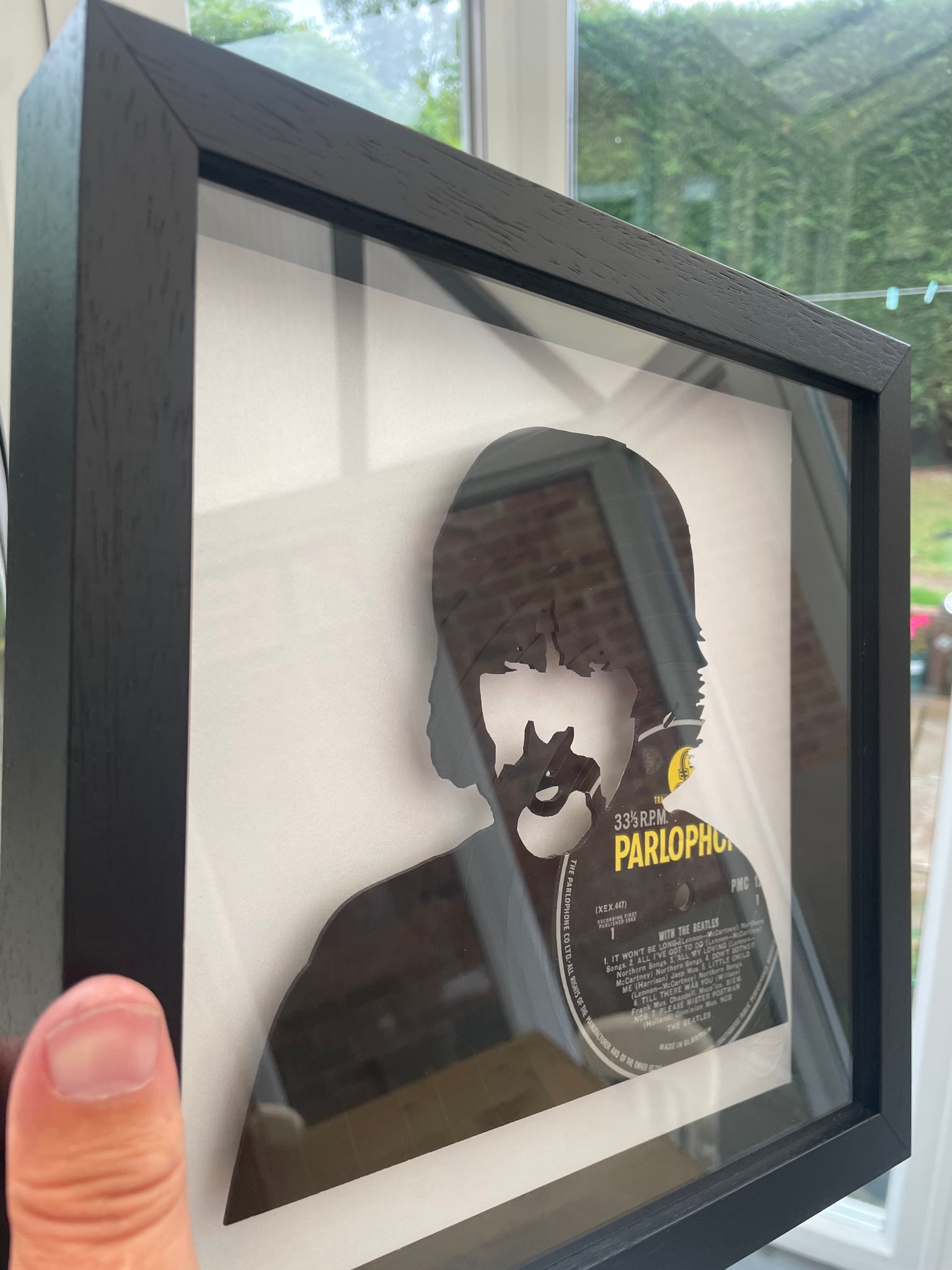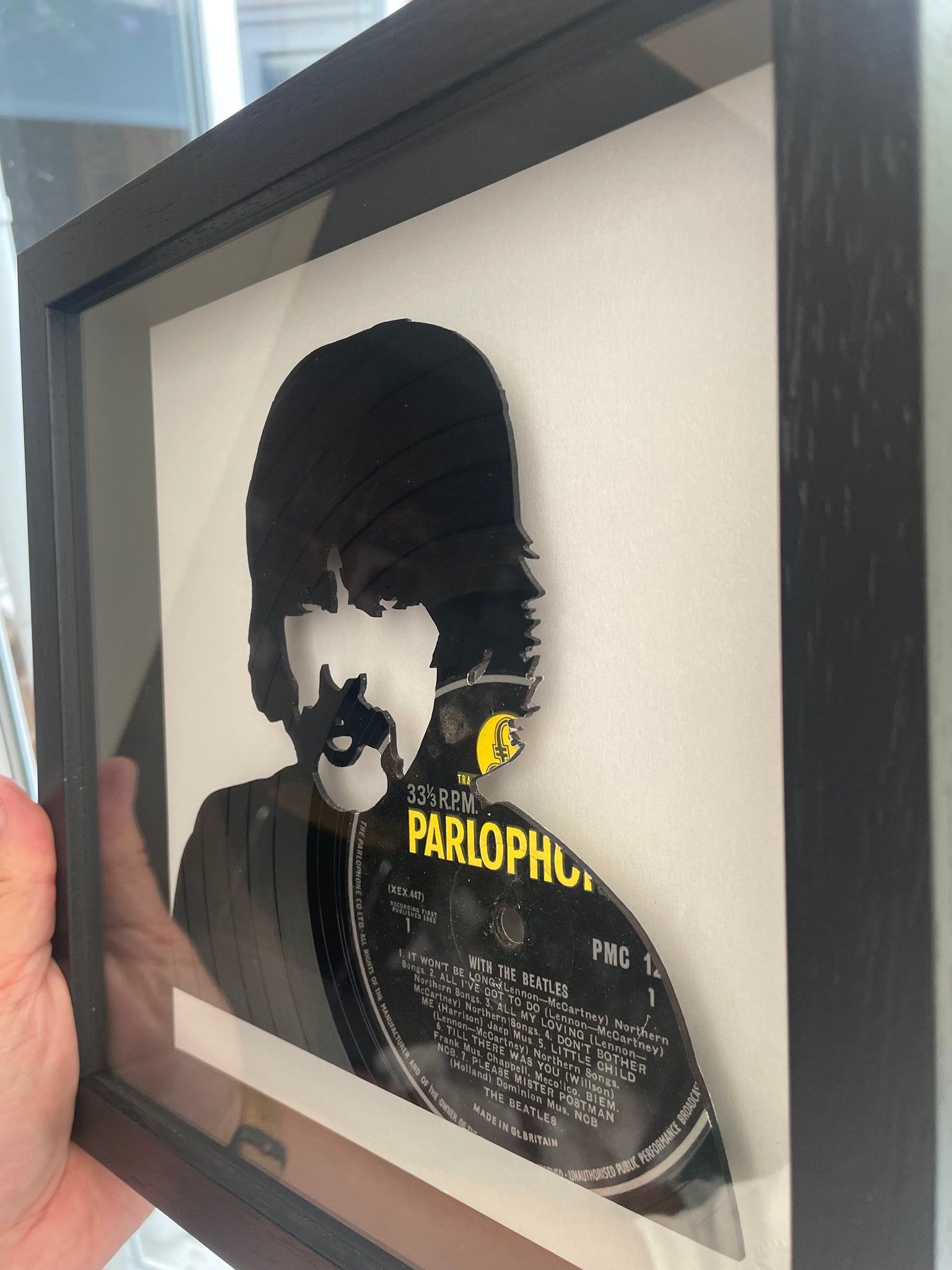 George Harrison vinyl art cut from an original Beatles album (album depends upon availability but if you have a particular choice please contact me and i'll see if I can source it for you). Mounted within a black wooden box frame and raised from a pearlescent base to compliment the label. The frames measures 25cm x 25cm (9.5 x 9.5 inches). All vinyl sourced from old, scratched or warped copies that have no collectable value or are in playable condition.