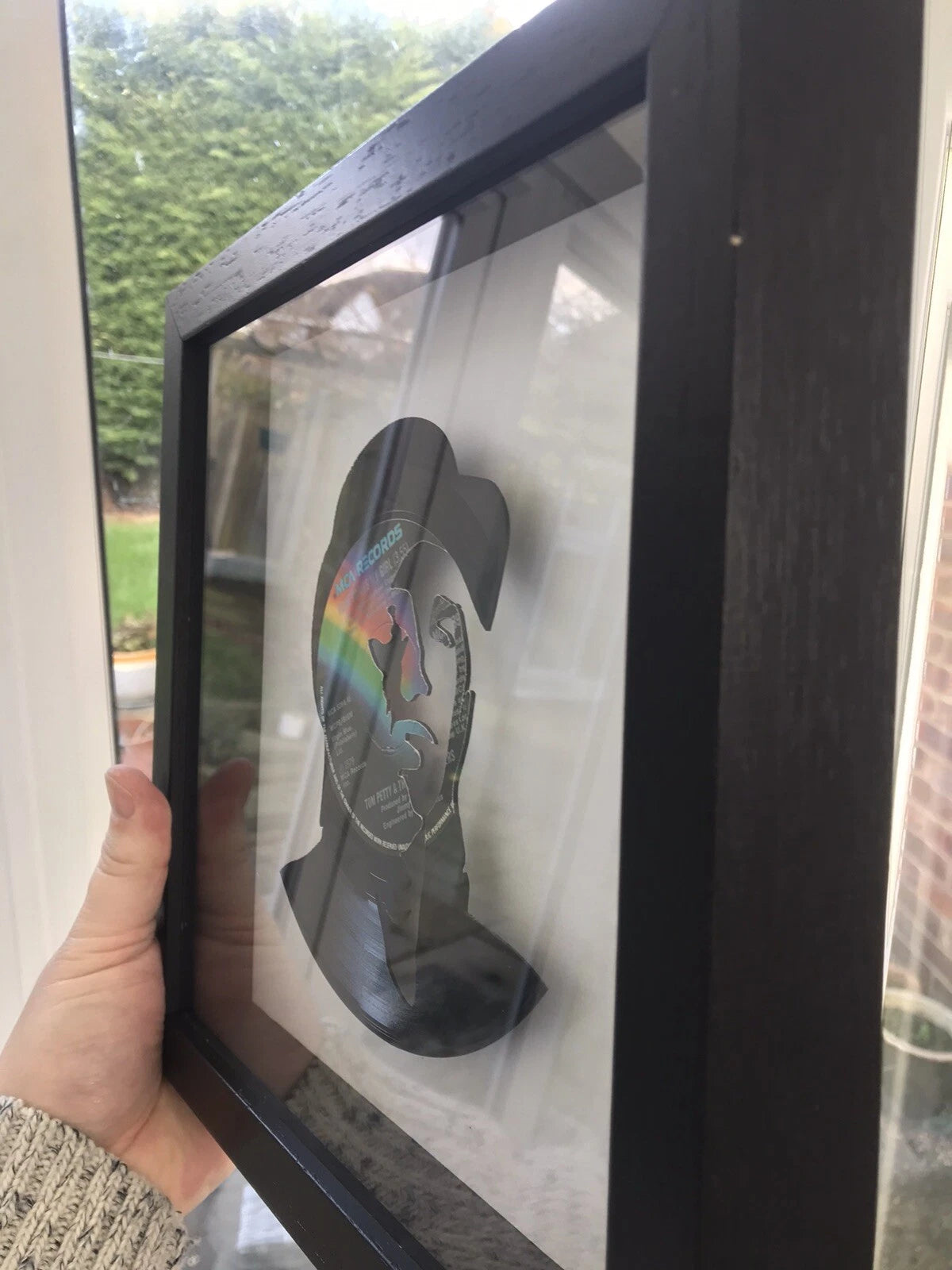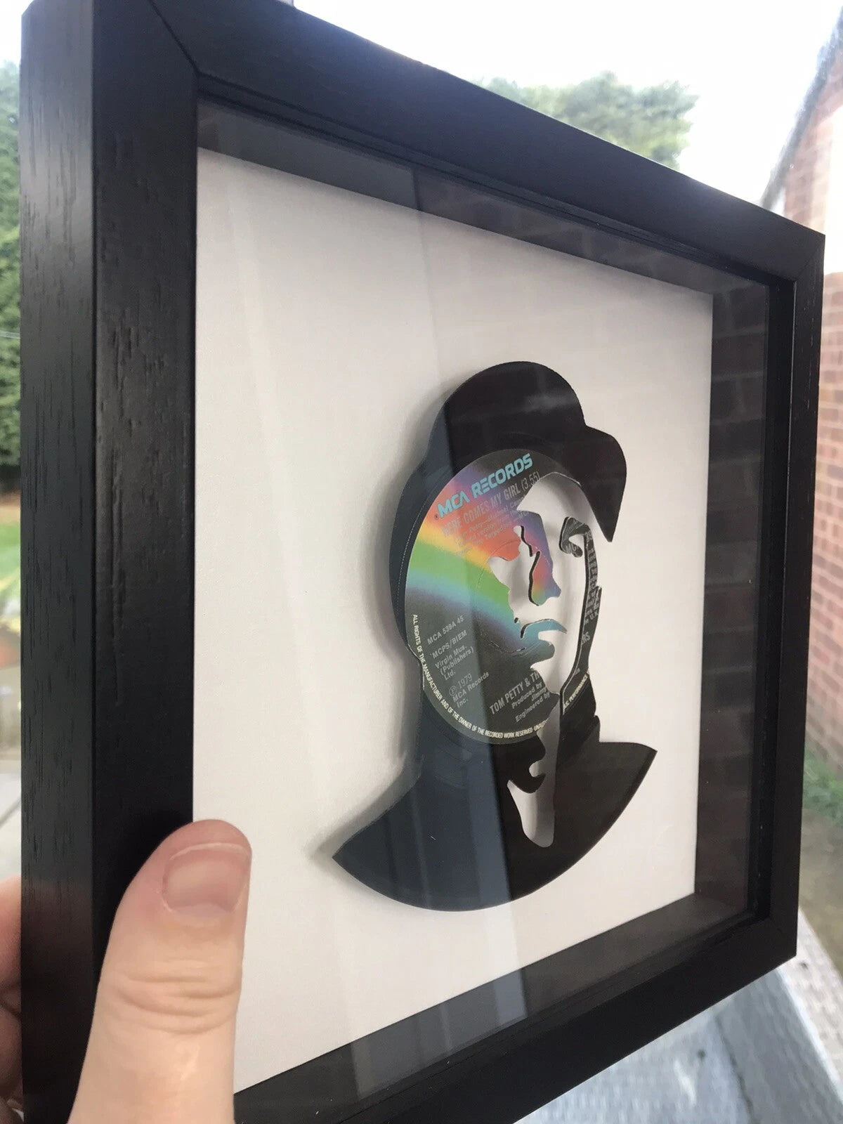 These pieces are made from vintage singles hand-cut and sourced by myself. There will normally always be visible wear and tear from being played such as scuffs to the vinyl and marks to the labels. This adds to the authenticity of the piece. Now, cut into novel shapes you can now appreciate not only some of your favourite records but now as a piece of individual art. Please note vinyl style of label may change slightly depending on availability when sourcing the record.