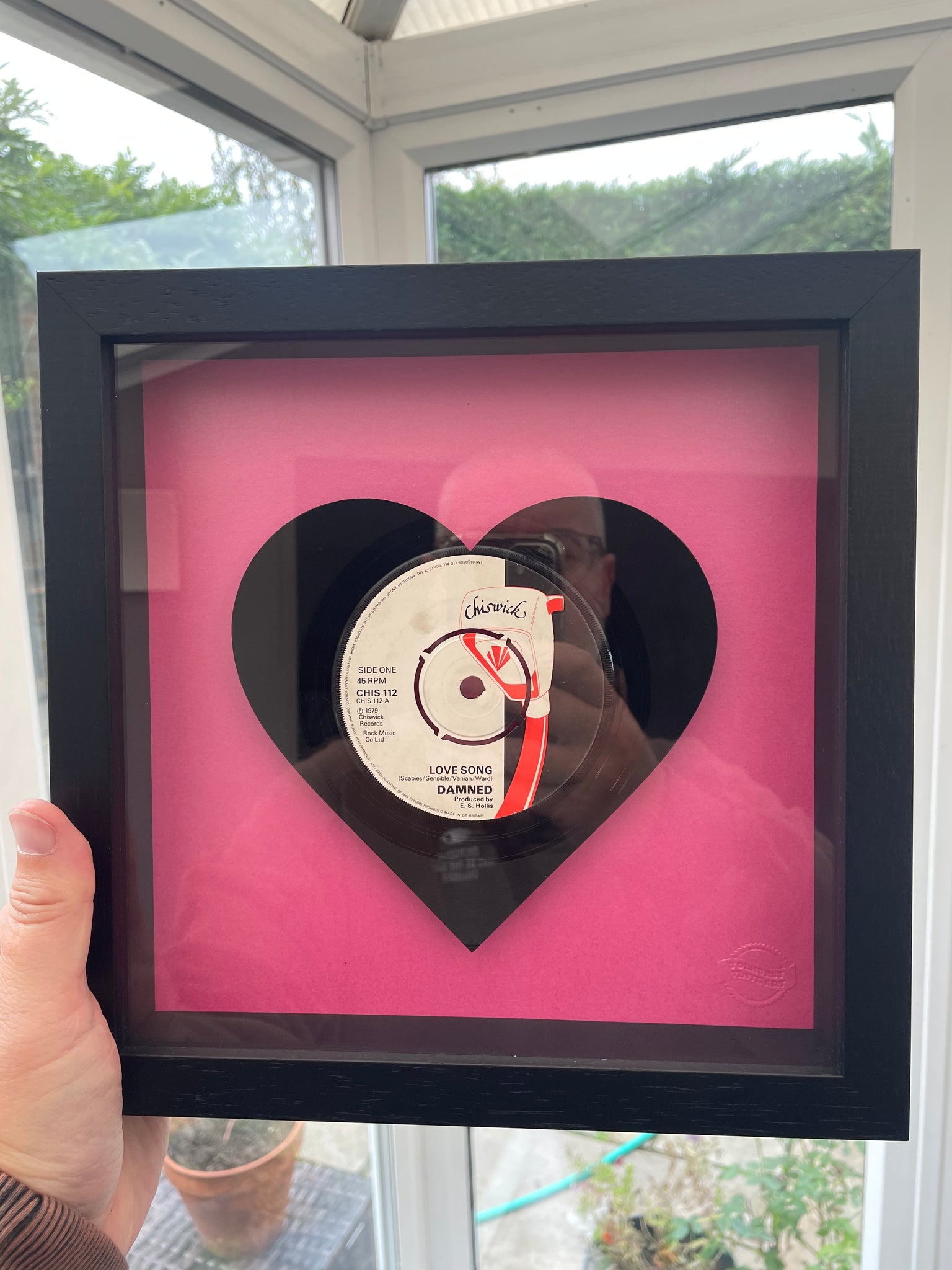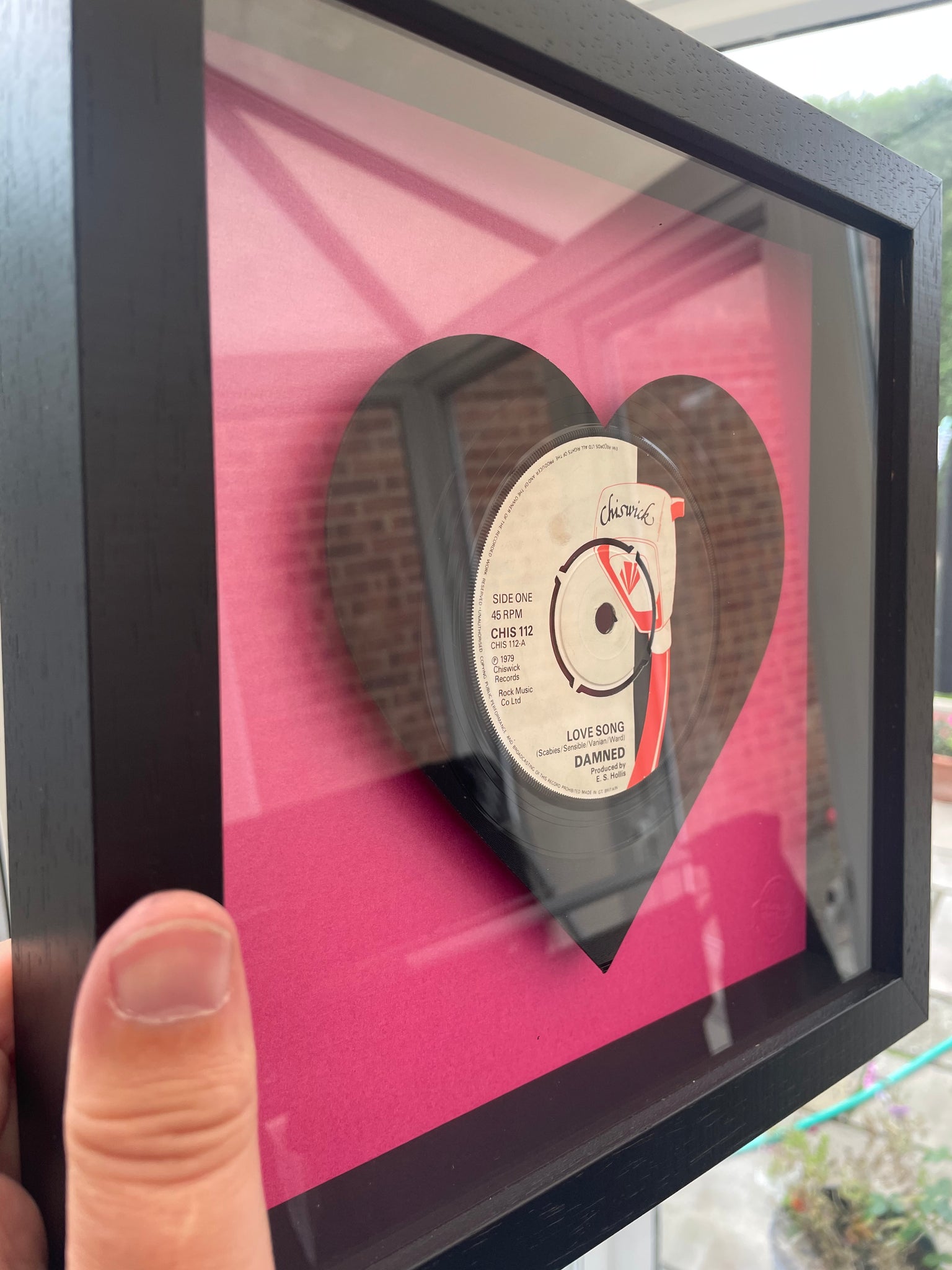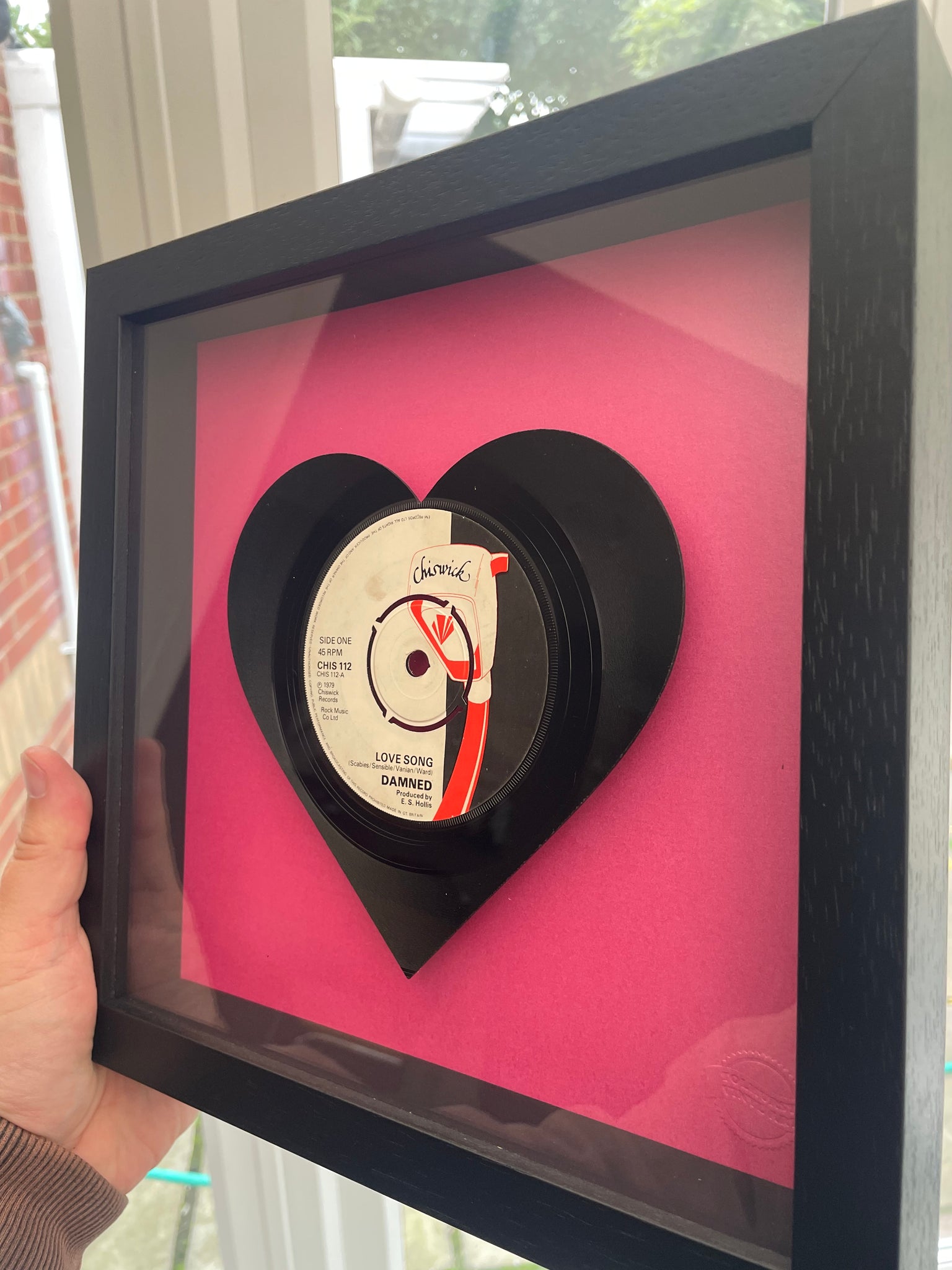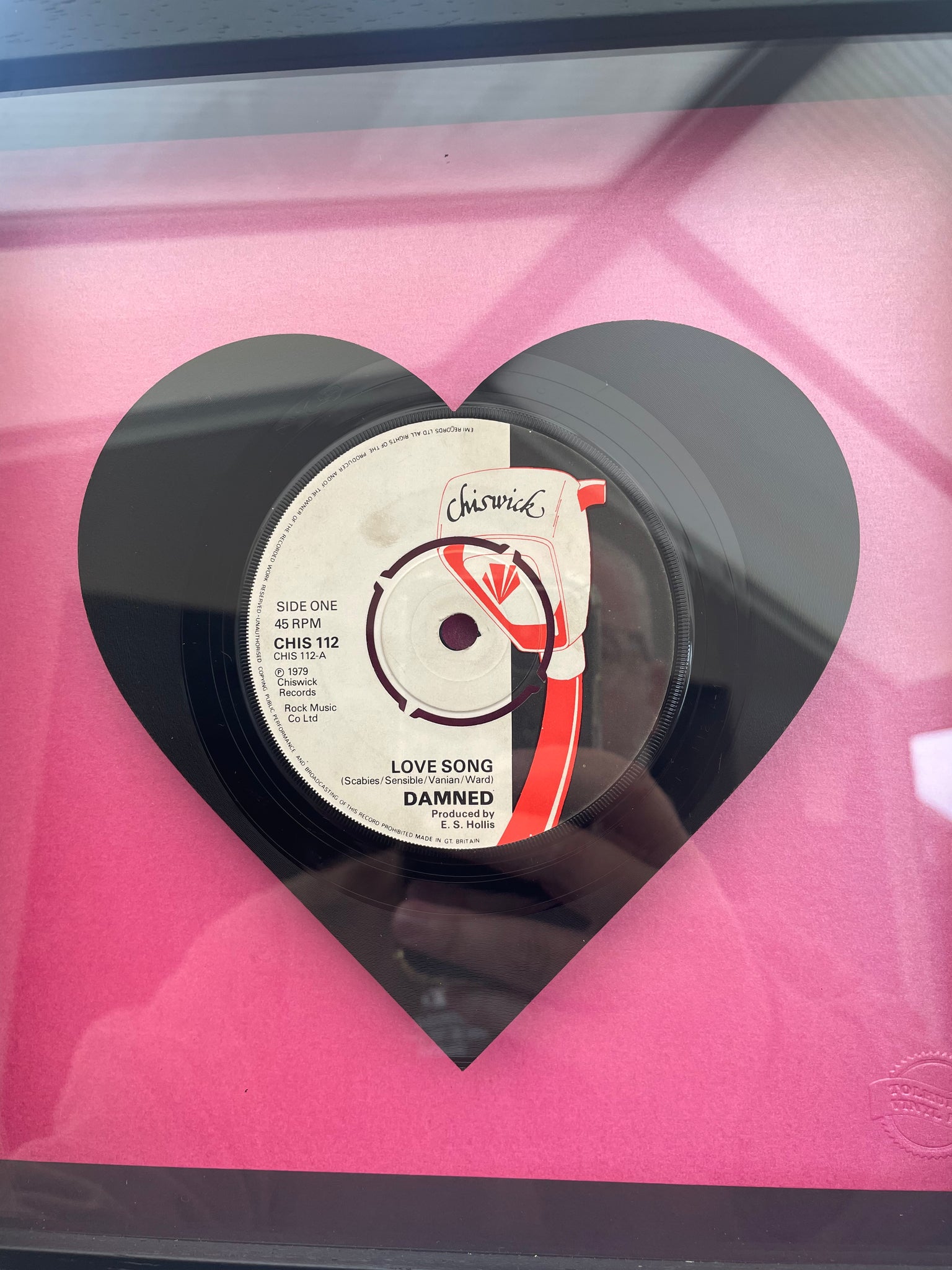 Individual piece of vintage vinyl art featuring The Damneds' Love Song cut into the shape of a heart. Mounted within a black wooden box frame and raised from a pink pearlescent base.
