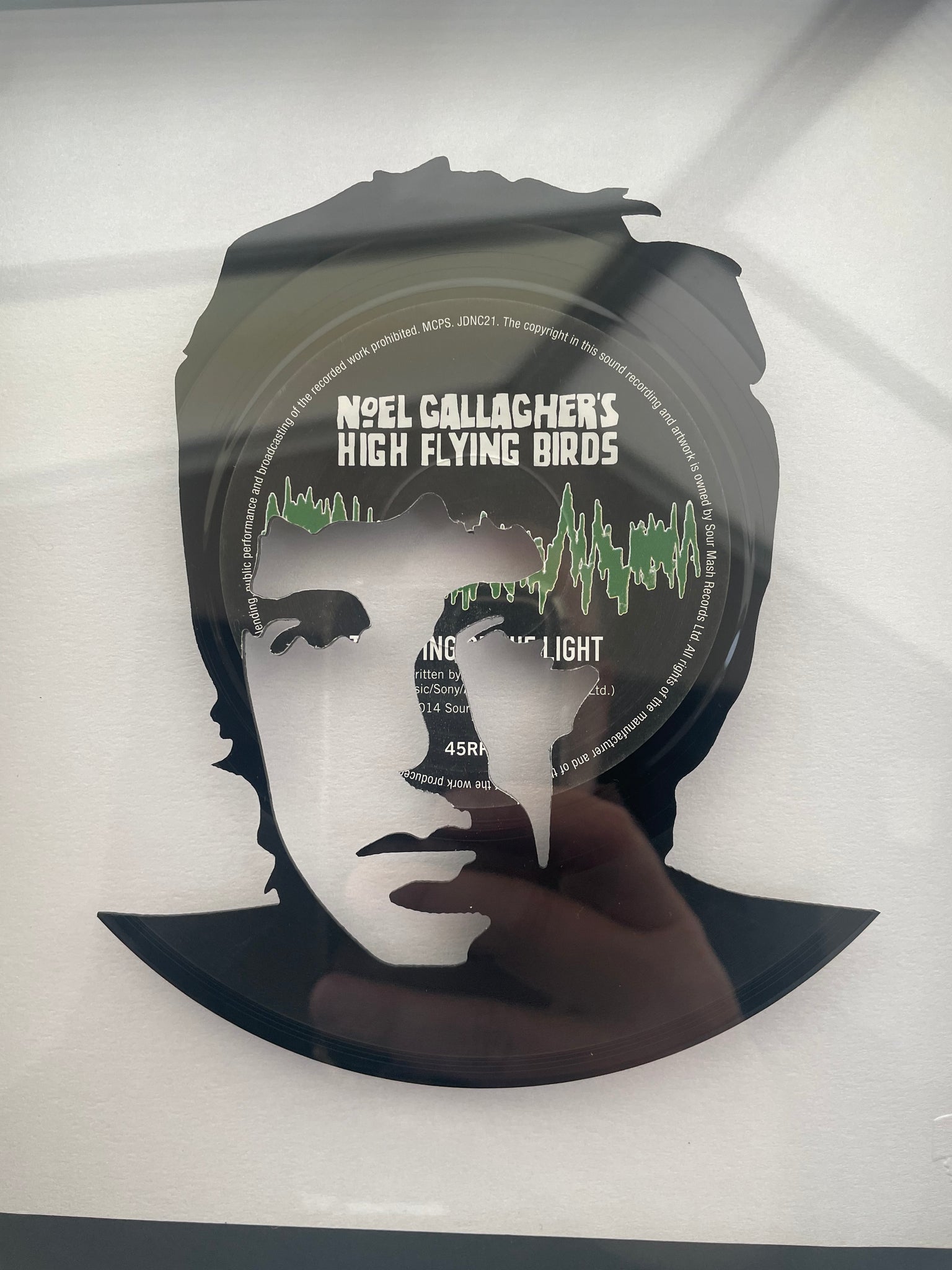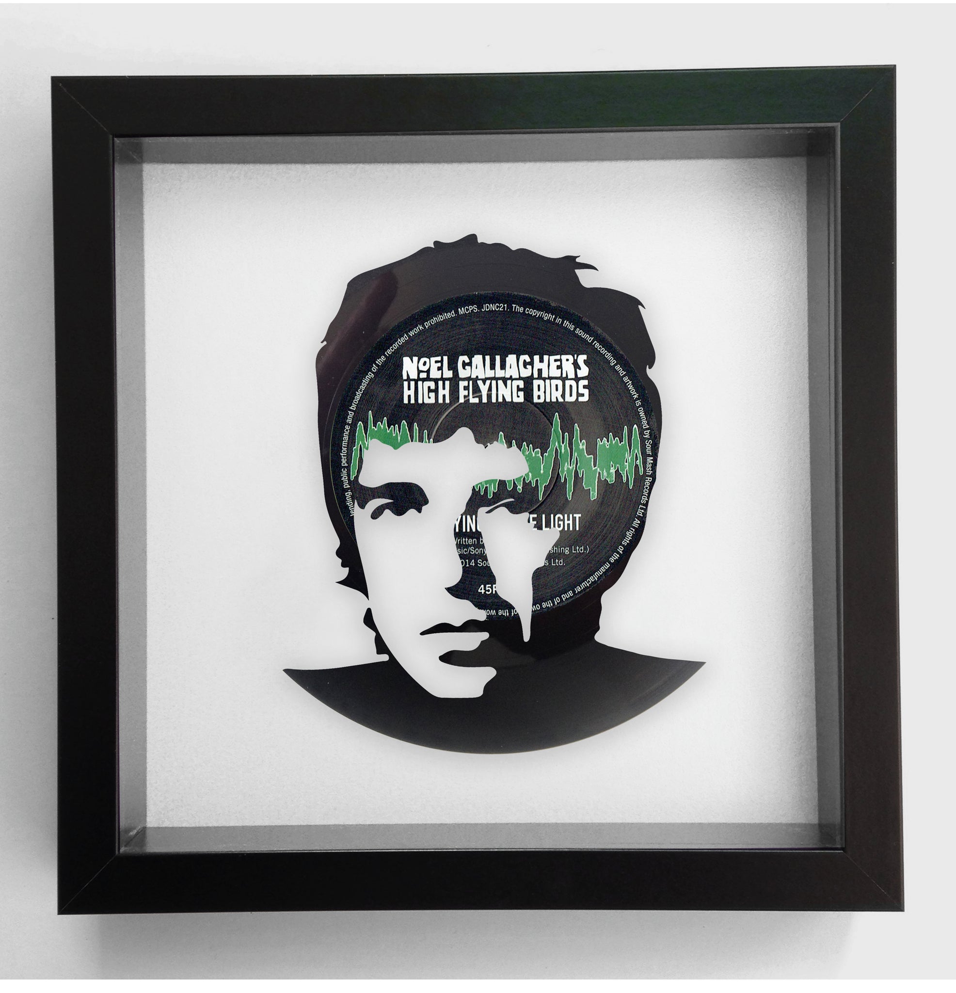 Individual piece of vintage vinyl art featuring Noel Gallagher's High Flying Birds' Lock All The Doors cut into the iconic silhouette of ex Oasis legend Noel Gallagher. Mounted within a black wooden box frame and raised from a white pearlescent base. Also available on The Dying Of The Light single, please indicate your preference when ordering.