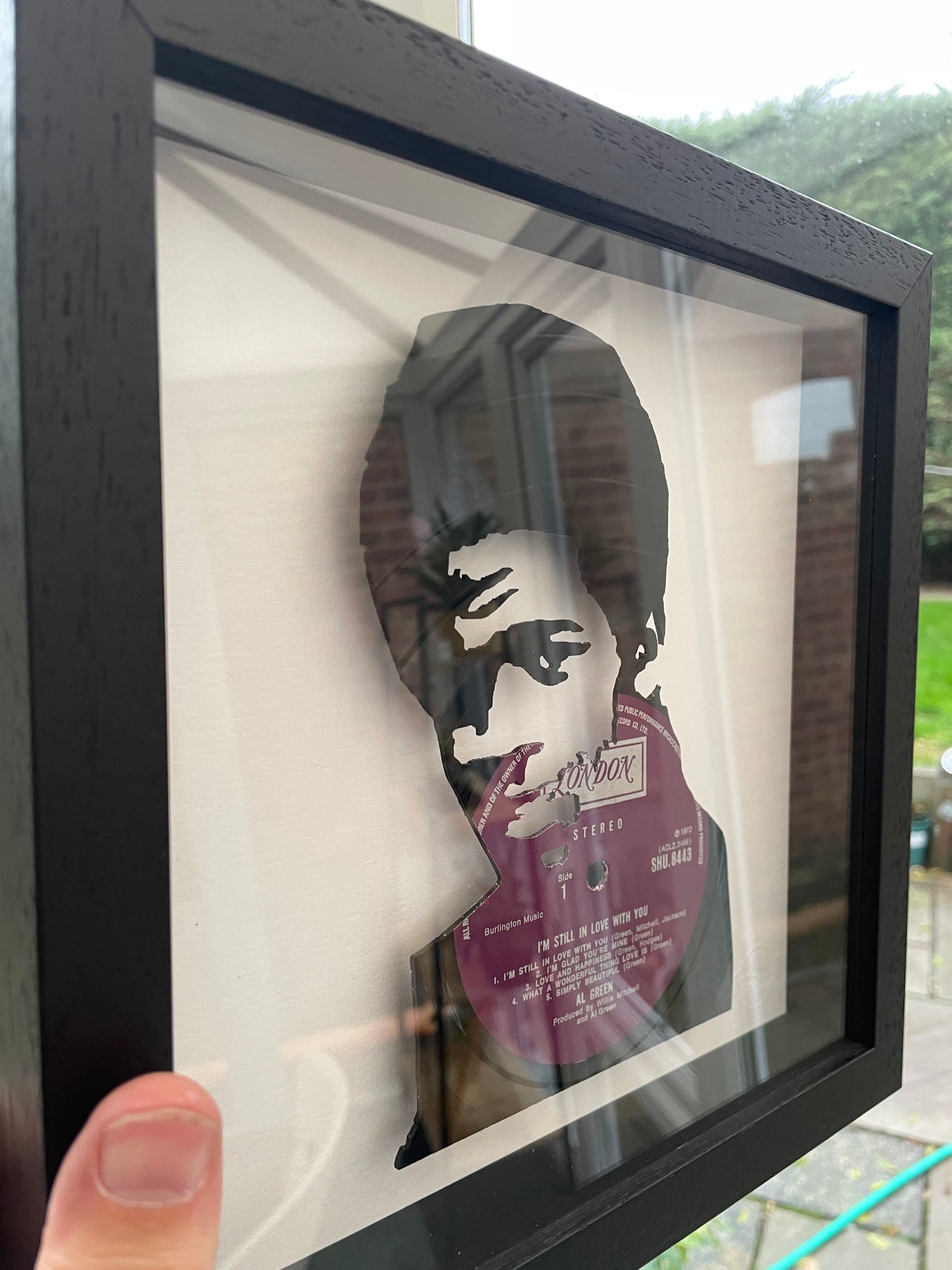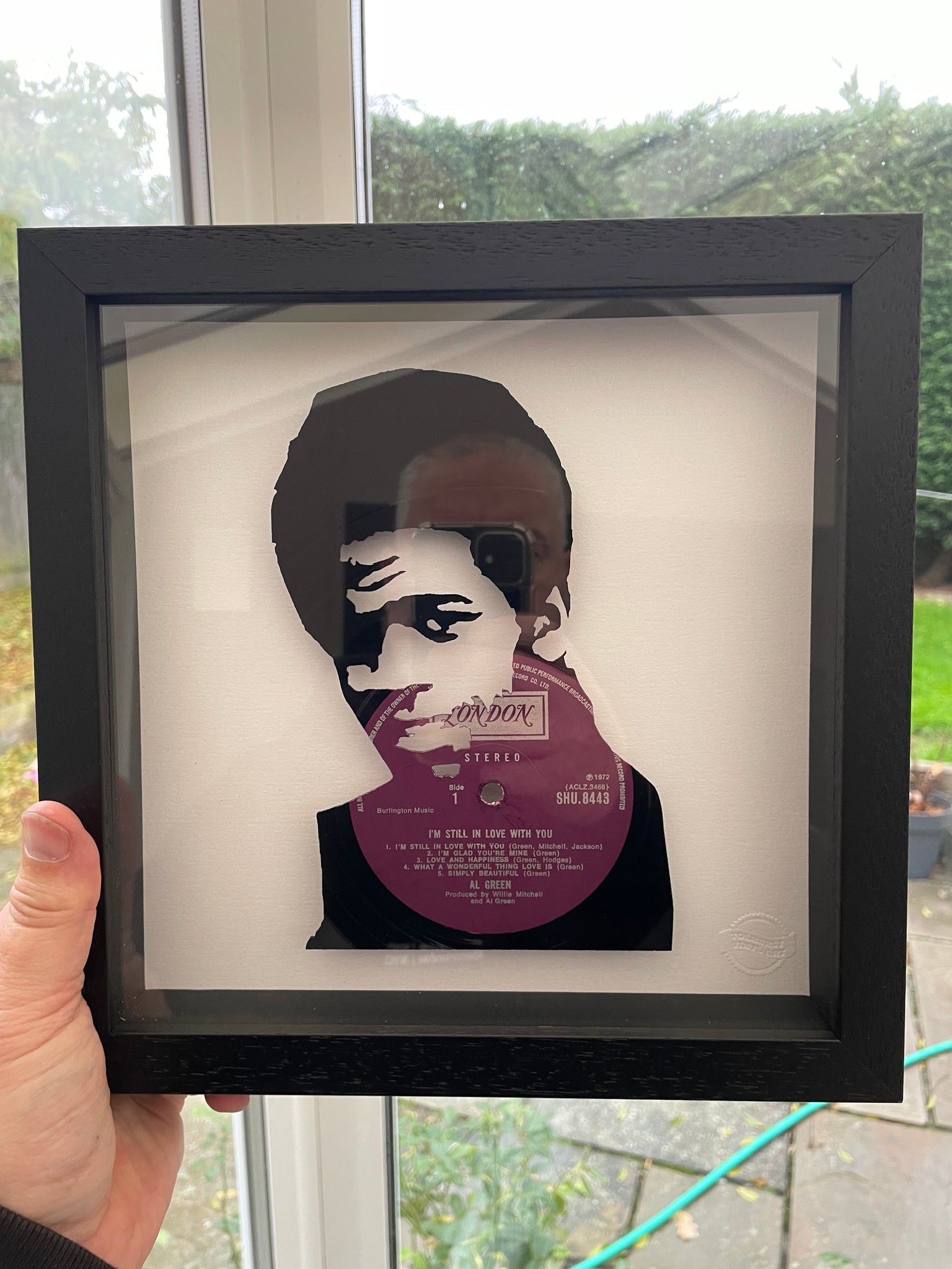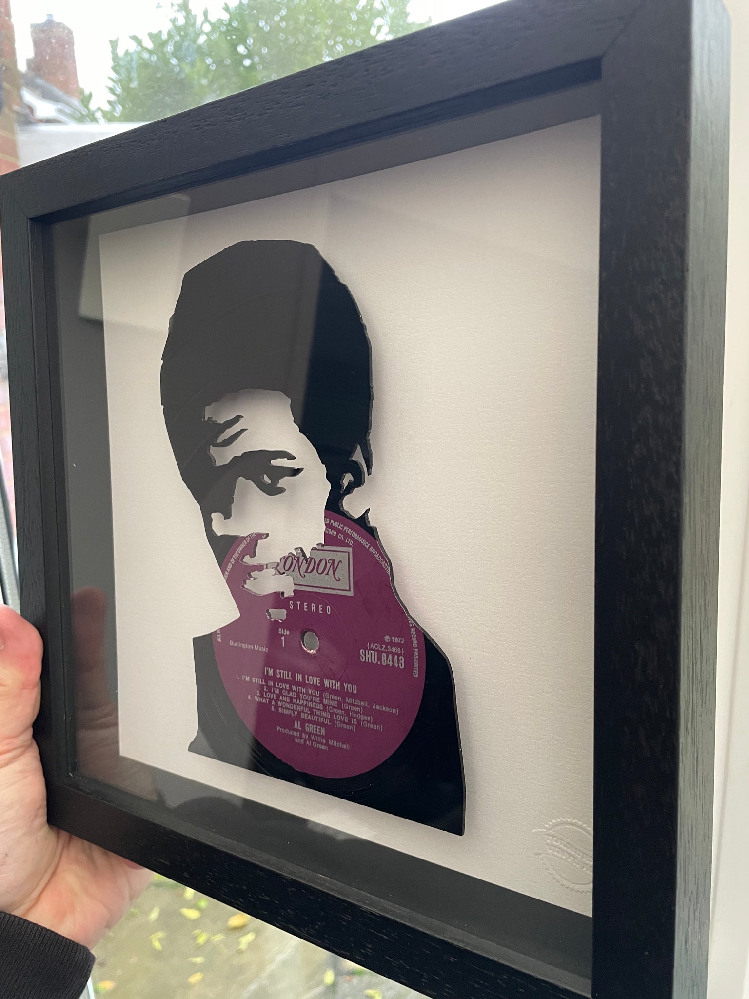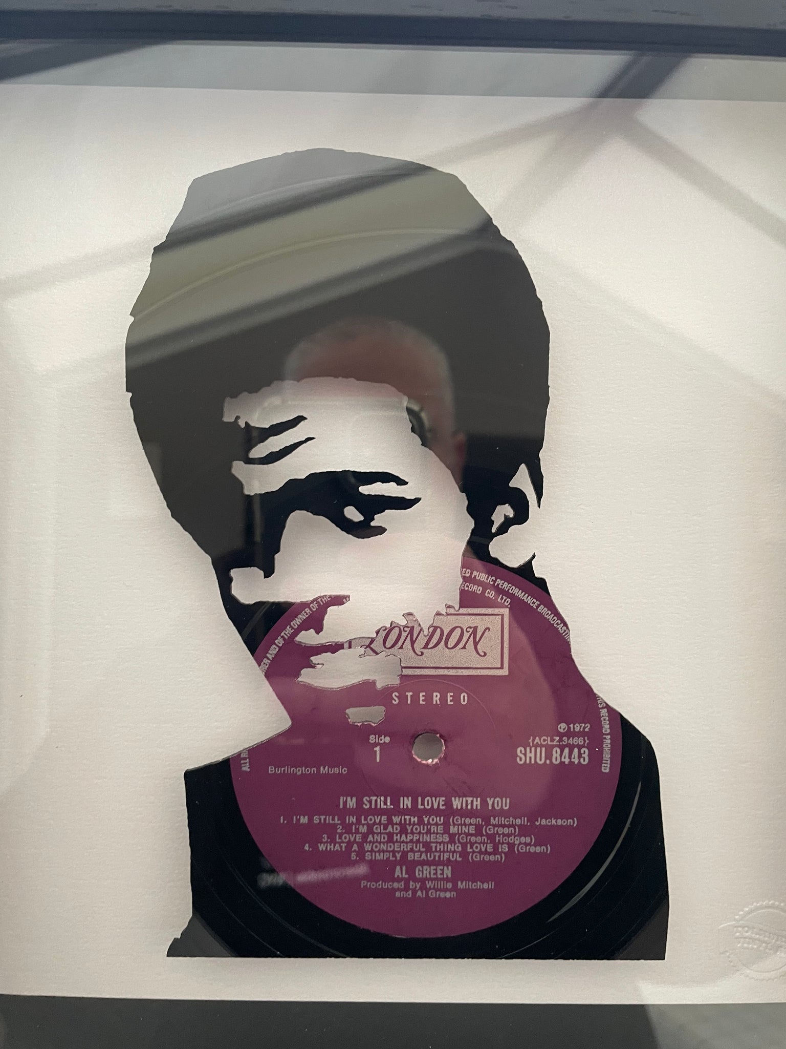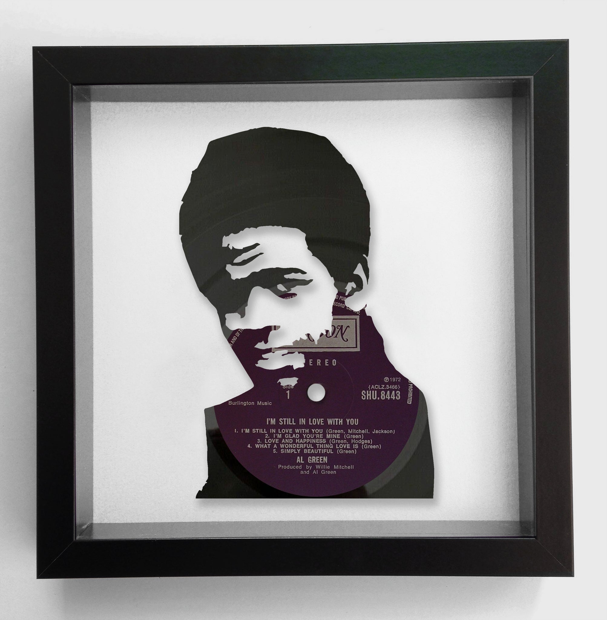 Individual piece of vintage vinyl art featuring the 1972 album I'm Still In Love With You cut into the shape of the iconic soul legend Al Green. Cut from an original LP on the London Records label. Mounted within a black wooden box frame and raised from a pearlescent base. Other Al Green albums available upon request.
