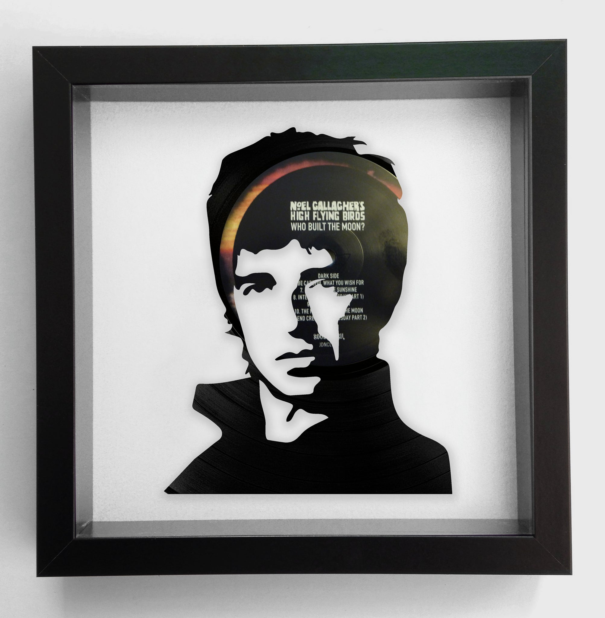 Individual piece of vintage vinyl art featuring an original High Flying Birds record cut into the iconic features of Oasis legend Noel Gallagher. Mounted within a black wooden box frame and raised from a pearlescent base. The frame measures 25cm x 25cm (9.5 x 9.5 inches).