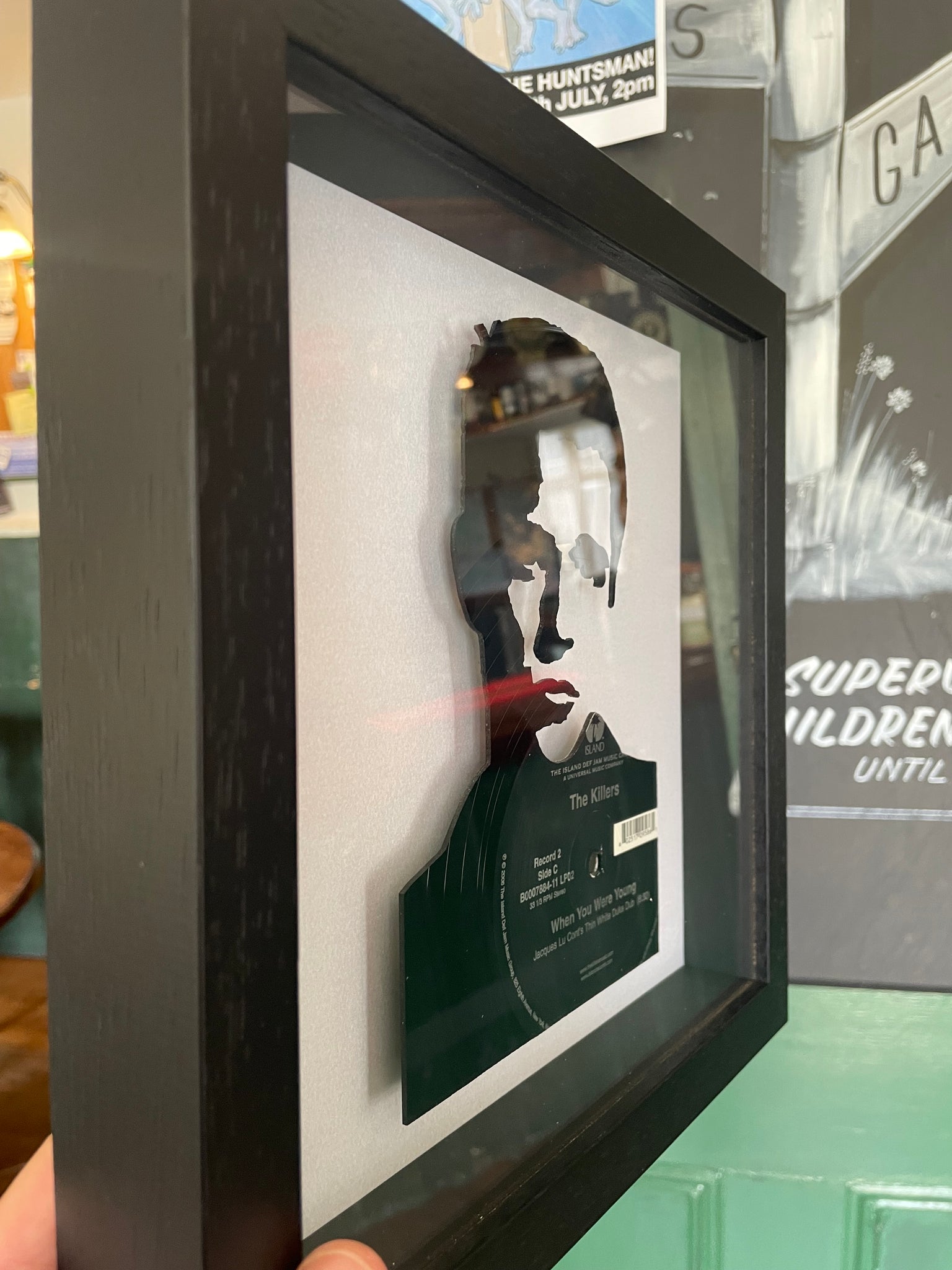 Individual piece of vinyl art featuring The Killers 2006 12” single When You Were Young on the Island Records label cut into the shape of frontman Brandon Flowers’ features. Mounted within a black wooden box frame on a white pearlescent base. The frame measures 25cm x 25cm (9.5 x 9.5 inches).