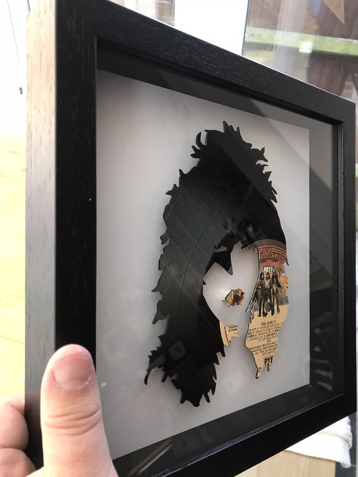 Individual piece of vintage vinyl art featuring Kiss's Alive II album cut to the silhouette of singer Paul Stanley. Mounted within a black wooden box frame and raised from a pearlescent base to compliment the label. The frame measures 25cm x 25cm (9.5 x 9.5 inches).
