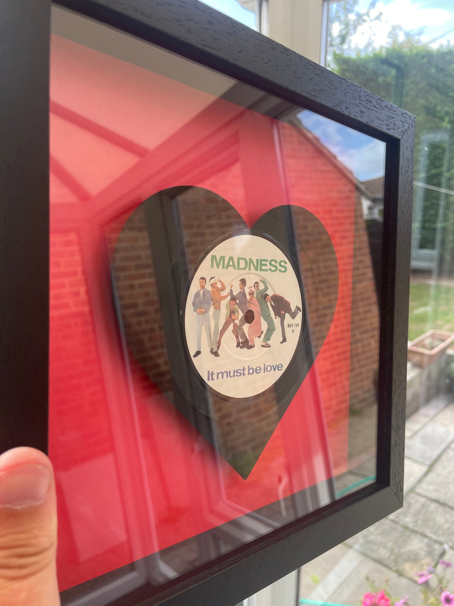 Individual piece of vintage vinyl art featuring Madness' single 'It Must Be Love'. Mounted within a black wooden box frame and raised from a red pearlescent base, but you can choose your background colour if you prefer.The frame measures 25cm x 25cm (9.5 x 9.5 inches).