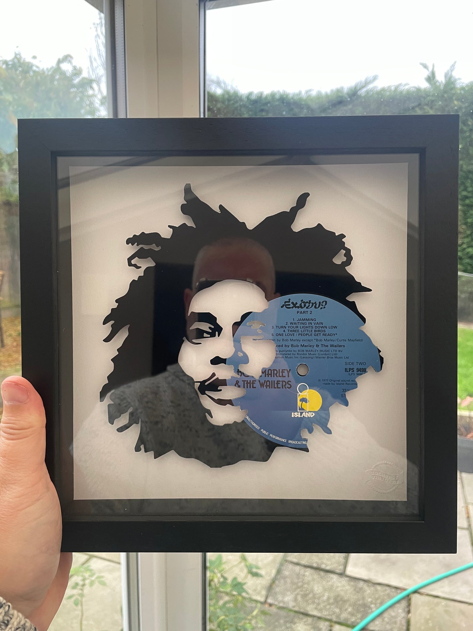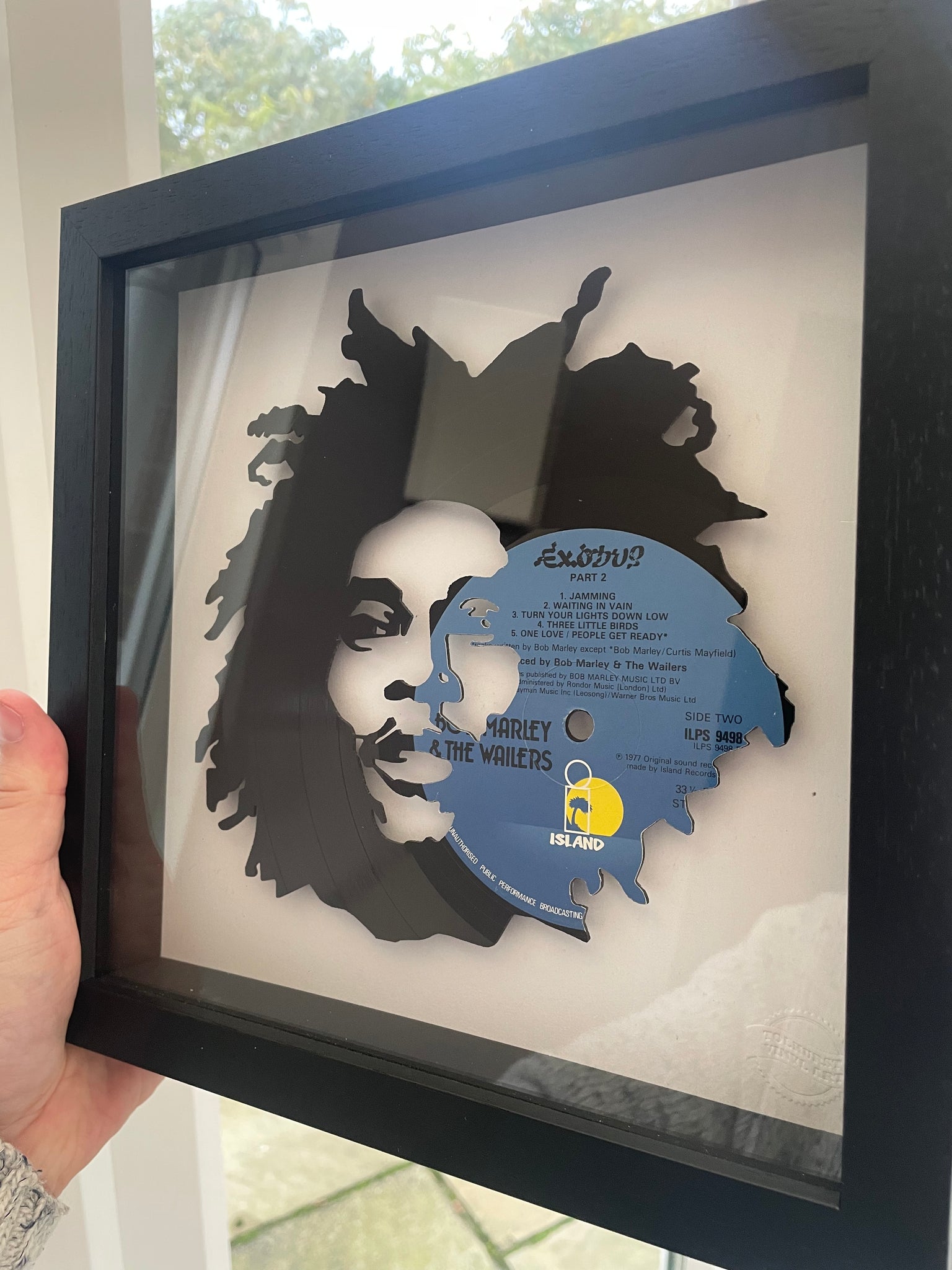 Individual piece of vintage vinyl art featuring the 1977 album Exodus by Bob Marley and the Wailers on the Island label. The record is cut to the iconic features of Bob Marley. Mounted within a black wooden box frame and raised from a pearlescent base. The frame measures 25cm x 25cm (9.5 x 9.5 inches).
