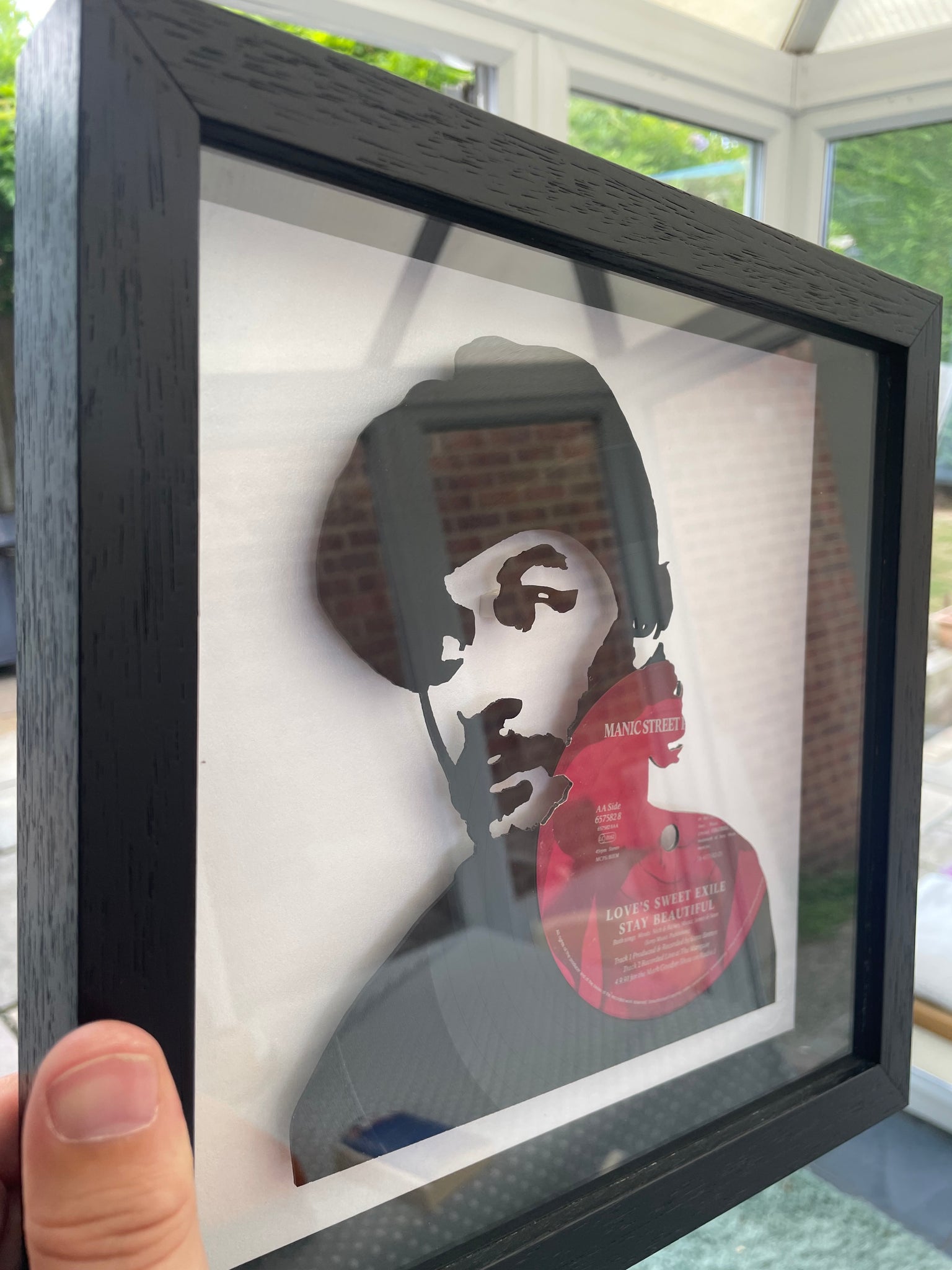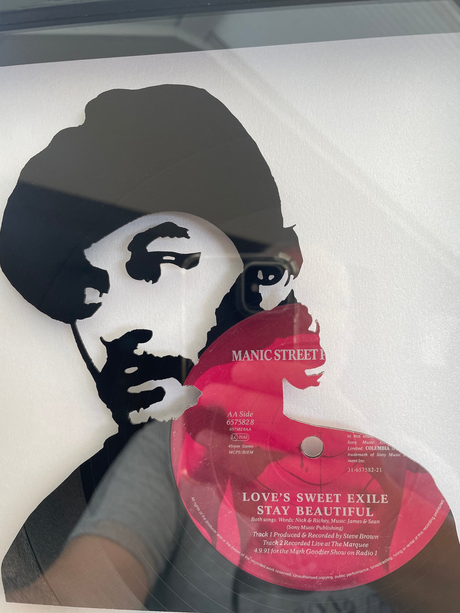 Individual piece of vintage vinyl art featuring the James Dean Bradfield of the Manic Street Preachers with the 1991 12" single Love's Sweet Exile cut into the frontman's iconic features. Mounted within a black wooden box frame and raised from a pearlescent base. Other singles also available.