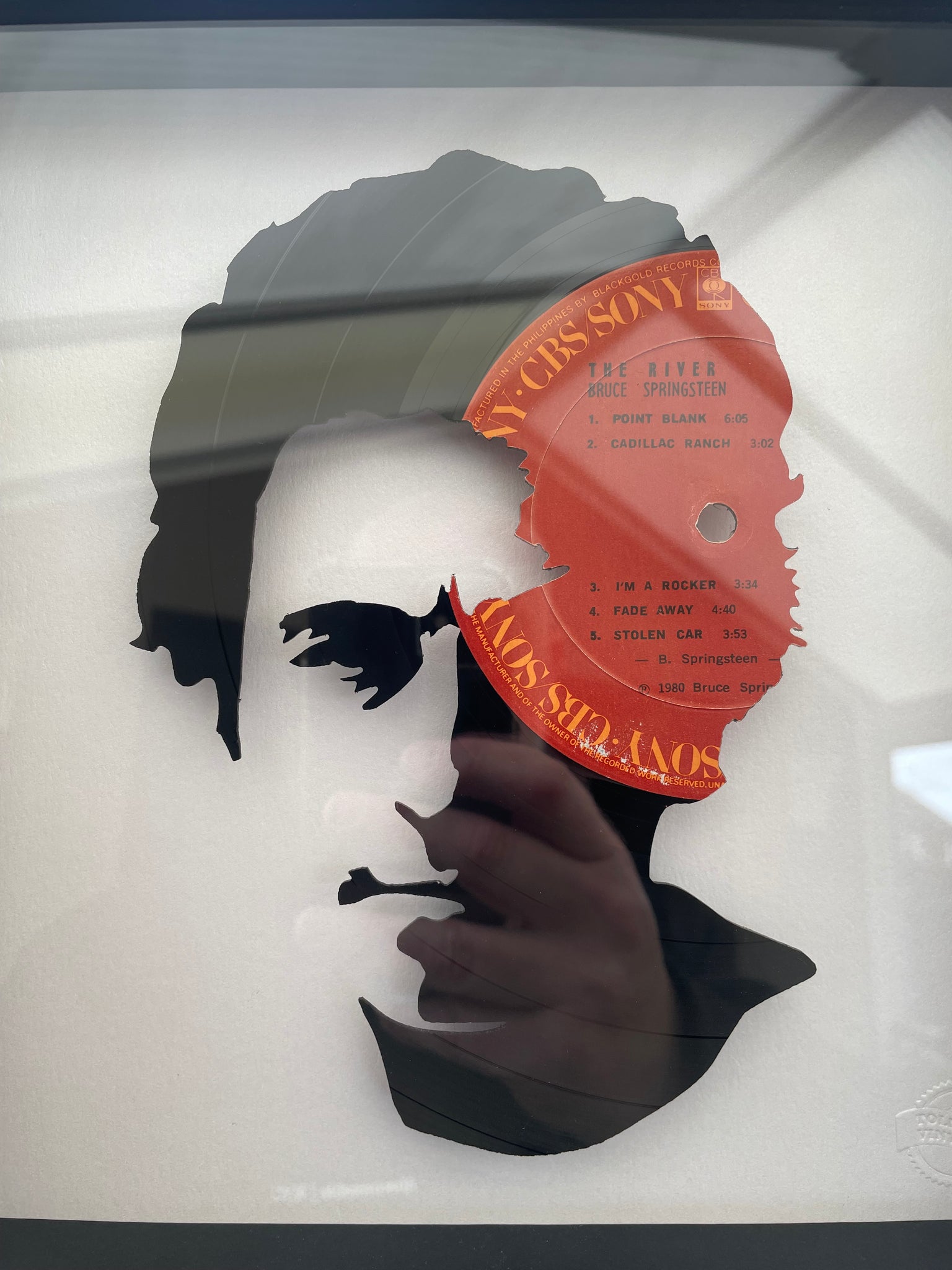Individual piece of vintage vinyl art featuring the Bruce Springsteen's 1980 album The River on the CBS label. Mounted within a black wooden box frame on a white pearlescent base. The frame measures 25cm x 25cm (9.5 x 9.5 inches). Other Springsteen records available upon request.